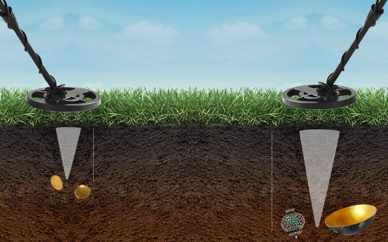 เป็นคำถามที่ตอบยากมาก โดยความลึกของเครื่องตรวจจับโลหะ เอาตามตรงมันไม่มีวิธีการวัดความลึกที่ชัดเจน แต่ความลึกจะขึ้นอยู่กับขนาดของโลหะนั้นๆ แต่ละโลหะ ก็จะแบ่งเป็นตามประเภท แล้วแต่ค่าการนำไฟฟ้าของโลหะแต่ละชนิด (เรื่องค่านำไฟฟ้าผมไม่ลงไปลึกเพราะมันจะออกแนววิชาการมากไป) เอาแค่เข้าใจง่ายๆว่าโลหะแต่ละชนิดมันไม่เหมือนเท่านั้นพอ