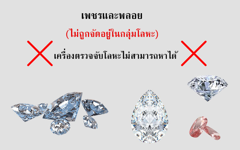 ตอบง่ายๆเลย ตรวจจับไม่ได้แน่นอน และ ไม่มีทางหาได้ เพชรและพลอย ไม่จัดอยู่ในกลุ่มโลหะ มันคือ คาร์บอน และ คาร์บอนประเภทนี้ยากที่จะใช้เครื่องตรวจหาได้ครับ ส่วนมากที่เราเห็นกันคือ หาด้วยวิธี 2 แบบ คือ