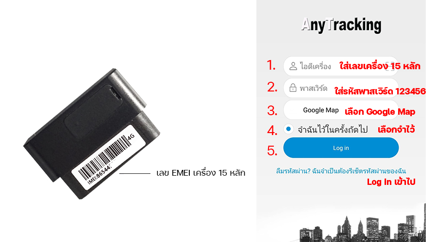 1. ใส่เลข EMEI เครื่อง 15 หลัก2. ใส่รหัสพาสเวิร์ด 123456 3. เลือก Google Map4. เลือกจำฉันไว้ในครั้งต่อไป5. Log in เข้าไป