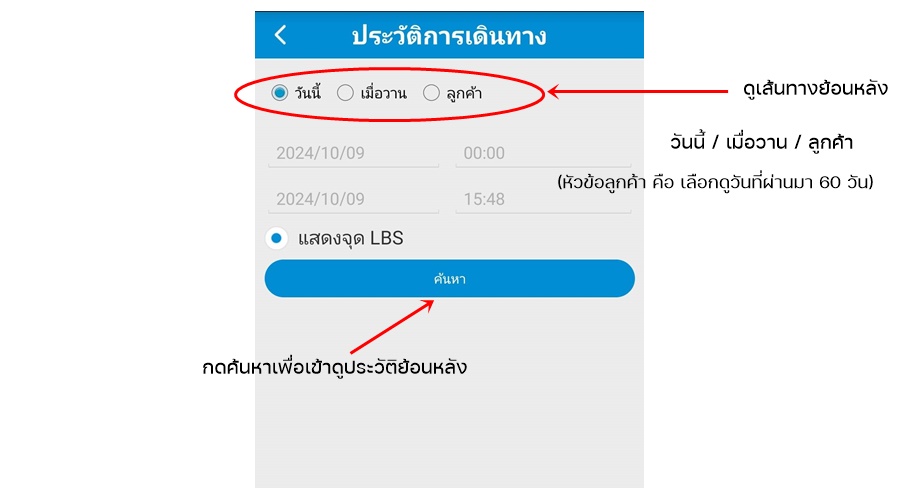 1. วันนี้ = ดูเส้นทางย้อนหลังของวันปัจจุบันที่ใช้งาน