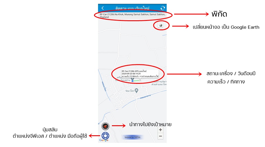 ดูพิกัดแบบออนไลน์ เมื่อ Log in เข้ามาแล้ว สามารถดูพอกัดสดๆแบบออนไลน์ผ่านมือถือ ซึ่งในพิกัด จะมีการแจ้งบอกรายละเอียดต่างๆดังนี้